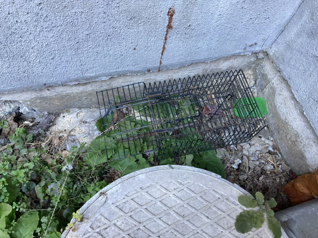 先ほどの配管画像の下に設置しました!本当ならネズミが歩いている導線上に設置するのが最も効果的ですが、配管の上などで難しい場合は、なるべく近くに臭いの強い餌を設置して誘引します。